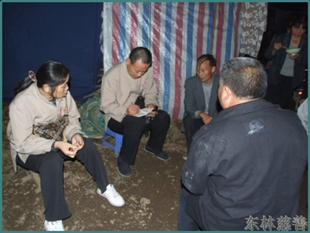 东林慈善功德会的工作人员在北川县陈家坝乡红岩村灾民安置点调查