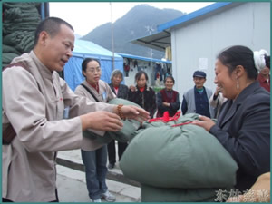 在发放前期,东林慈善功德会四川灾区绵阳长期援助点的王秀兰居士等进行了大量的调查工作,王居士不顾子宫瘤的病痛,步履蹒跚的身影走遍了灾区的每一个角落,地震发生以来,她每天三四点起床,晚上十一二点回家,每天从绵阳市往返灾区数次。为了将物资落实到最需要的地方,时常步行四五小时将救灾物资挨家挨户送到深山中最贫困的灾民手中。