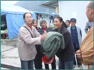 10月24日下午,东林慈善功德会湖北武汉志愿者赶到绵阳,一起到达擂鼓镇的灾民安置点对最困难的村民发放了共500床棉被。