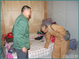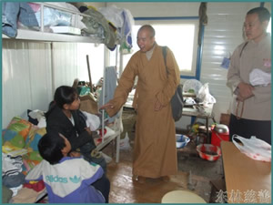东林慈善功德会会长镜义法师和工作人员深入灾民的板房了解他们的保暖情况和生活状况