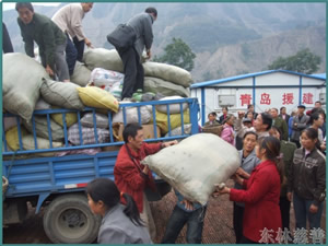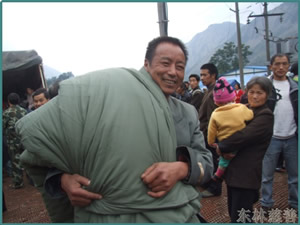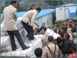 10月24日和25日东林慈善功德会分别向北川灾区的擂鼓镇和陈家坝乡红岩村灾民安置点发放了六千多床价值近四十万元棉被和大量衣服。为即将入冬的众多灾民及时送去了温暖和关怀。