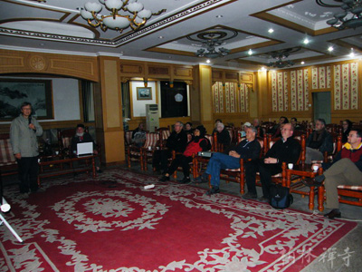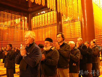 在寺期间,美国客人体验了上殿、过堂、禅修、供茶等修行生活。明海大和尚在普贤阁为大家进行了禅修开示,冯克强先生为大家作了关于禅茶的讲演。
