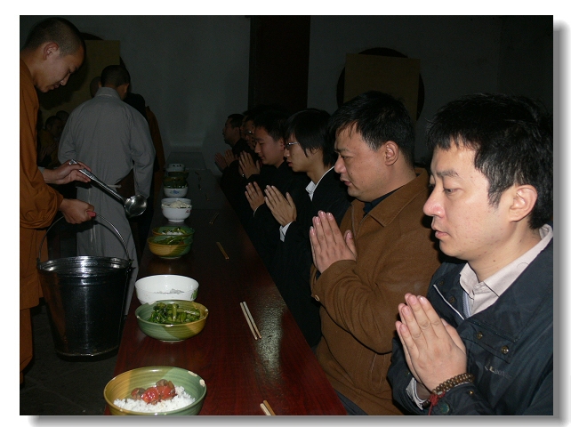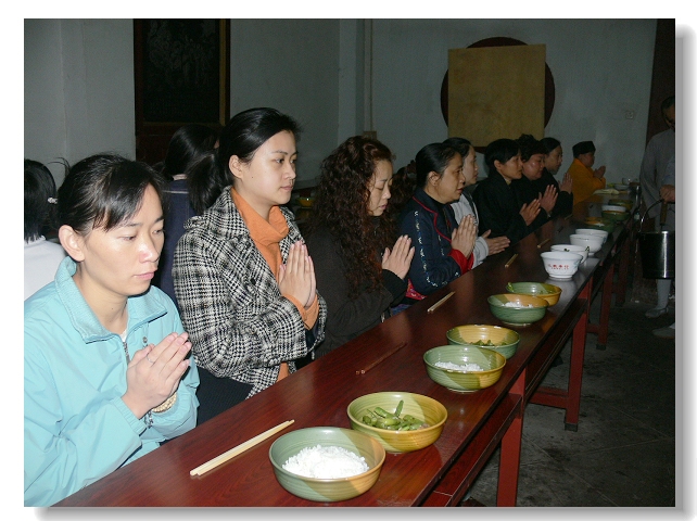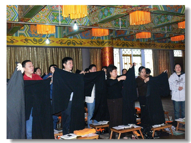 《在家居士律仪》第三次的课程是学习三归五戒。在老师的指导下,大家穿着古时的礼服上课,过堂,时时注重礼节,遵守居士戒律,庄严威仪,理论与实际相结合,真正做到学以致用。