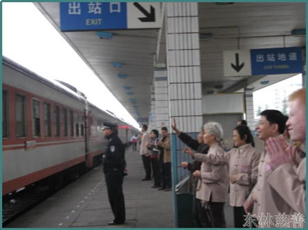 三点后,十四辆车组成的爱心车队浩浩荡荡地载着这批幸运的老人们共同出发到达了九江火车站。由镜义法师带领,每位老人都由志愿者的搀扶下,共同登上了前往北京的火车。在整个过程中,老人们得到了东林慈善功德会工作人员和志愿者们的悉心陪伴照顾。为了确保老人们一路的平安,他们由镜义法师亲自带领,由功德会的两名工作人员和慈善门诊的两名医生共同陪同护送。虽然他们看不清,但个个都因感受到大家给予的温暖而喜笑颜开。四点,在大家的歌声中,火车载着这批满怀着感激和快乐的老人们缓缓启程了...