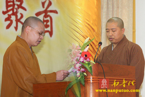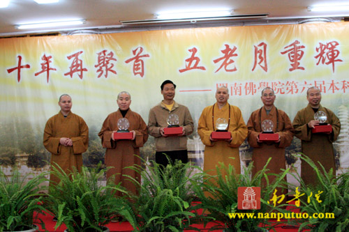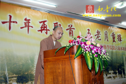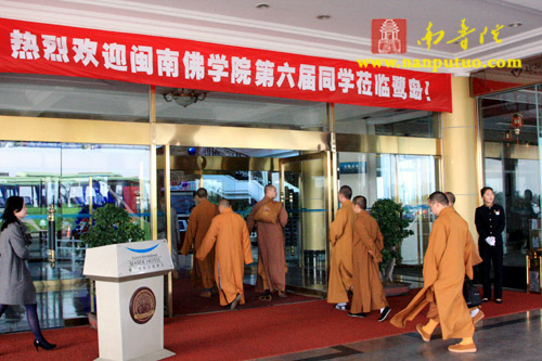 2008年12月25日上午10时,闽南佛学院第六届同学毕业十周年聚会在厦门南普陀寺讲堂隆重举行开幕式。受闽院第六届全体男女众同学之邀,厦门市民宗局一处苏人登处长、钟晓波先生,厦门市佛教协会常务副会长定恒法师、副会长法云法师以及曾任第六届同学任课法师的南普陀寺首座及闽院图书馆馆长了法法师、闽院副院长法源法师、闽院院长助理兼教务长传明法师、闽院办公室副主任悟源法师和多位在家老师出席了开幕式。仪式由第六届道圣同学主持。