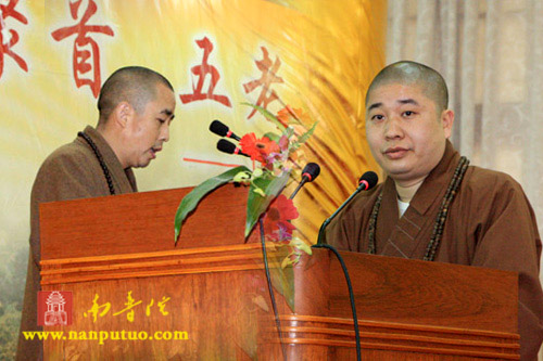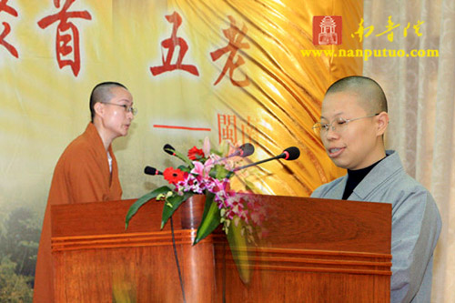 开幕式共有八个议程。在主持人介绍参加仪式的领导和嘉宾之后,同学会会长广献同学宣读了“五老峰同学会”邀请函。继而,男众召集人净心同学代表同学会致辞,闽院领导、法师代表致辞(了法法师、法源法师、传明法师均作了发言)、定恒法师代表厦门市佛协致辞、苏人登处长代表厦门市民宗局致辞、许长庵代表在家老师致辞,则悟同学、智明同学、修明同学、法缘同学代表第六届同学先后发言。