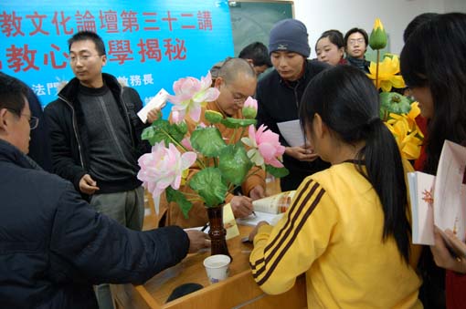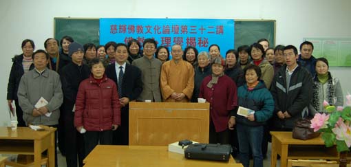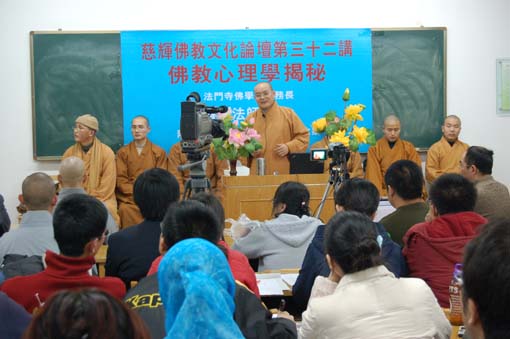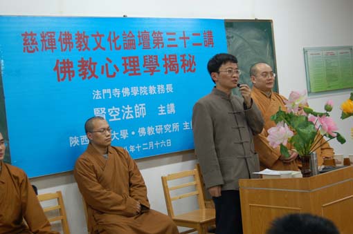 12月16日,法门寺佛学院教务长贤空法师作客"慈辉佛教文化论坛",担任第三十二讲主讲人,主讲《佛教心理学揭秘》。讲座地点为师大新校区文津楼405室。中国禅学主编、陕西师大佛教所所长吴言生教授主持了讲座。前来听取讲座的有西安清凉寺住持传恒法师、法门寺诸位法师、咸阳师范学院的诸位老师、北大国学班学员、华商书院学员,以及150余位师范大学的硕博士研究生和本科生等。