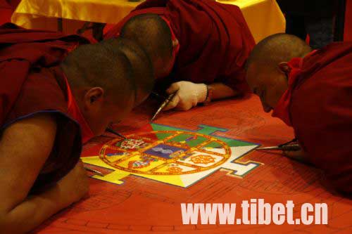 坛城,系梵文曼荼罗的意译,源于佛教密宗。密宗在修法时,为防止“魔众”侵入,在修法处建方圆形的土坛,安请佛尊于内祭供。坛城图是藏传佛教艺术中吸引人的精华部分,构图以几何图形为主,具备高超技艺和丰富宗教知识的艺师才能绘制。这次进行现场制作表演的僧人均来自西藏藏北第一大寺——那曲孝登寺。据他们的领队永旦加措介绍,这些僧人的修行时间都在10年以上,经过严格的训练,熟记坛城的每一个细节及做法,而且制作过程必须非常凝神和专心,不能触碰。