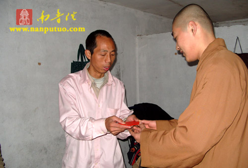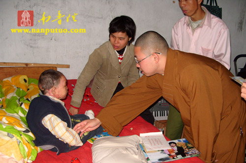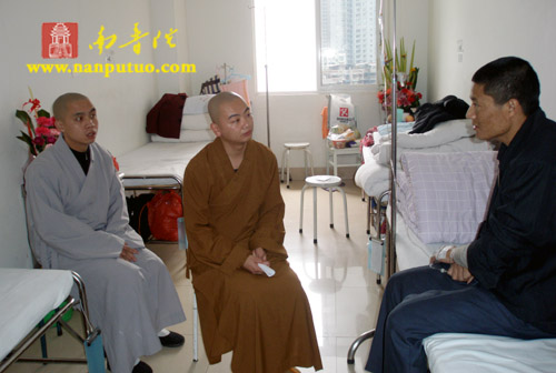 滴滴甘露,点点爱心。新年来临之际,闽南佛学院男众部众缘爱心小组成员,在教导长达源法师及各位法师的倡导下,于08年12月27日上午,分别前往第一人民医院和曾厝垵,看望肝癌患者、肾病患者及烧伤儿童,并给他们送去了我们的心意和新年的祝福。病人和家属对此都心怀感恩,欢喜而泣。
