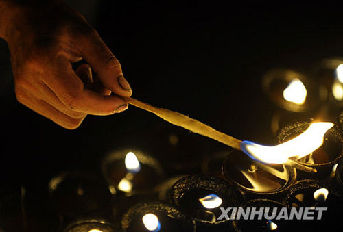 12月21日晚,拉萨大昭寺的一位僧人在点酥油灯。