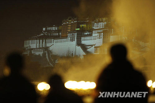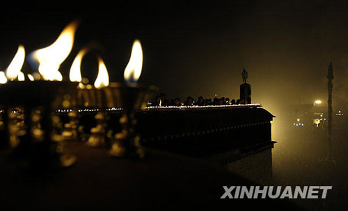 12月21日晚,拉萨大昭寺的僧人点燃酥油灯。