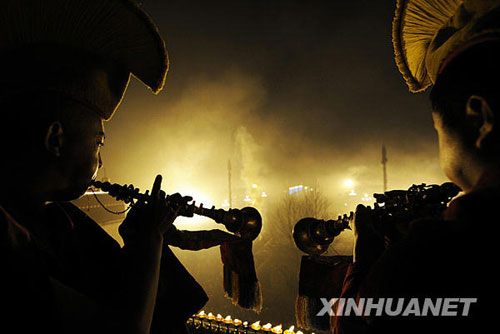 12月21日晚,拉萨大昭寺的僧人在吹法号。