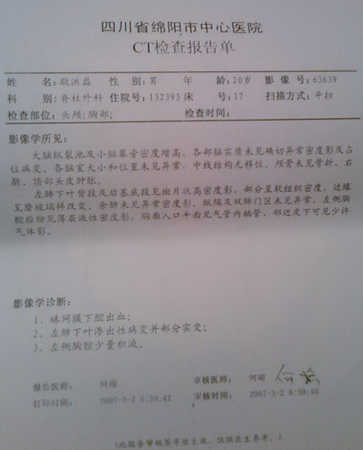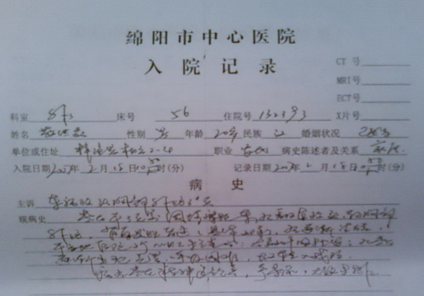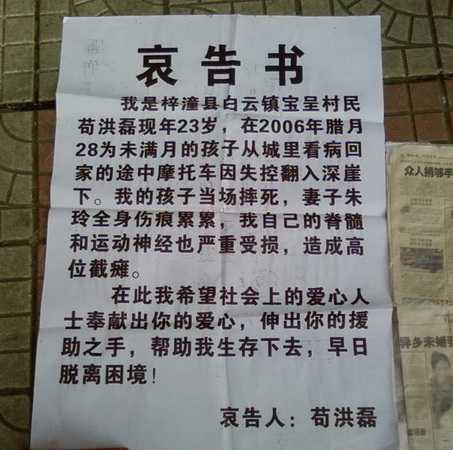 “我是梓潼县白云镇宝程村村民敬洪磊,现年23岁,在2006年腊月二十八为未满月的孩子从城里看病回家的途中摩托车因失控翻入深涯下。我的孩子当场摔死,妻子朱玲全身伤痕累累,我自己的骨髓和运动神经也严重受损,造成高位截瘫。在此我希望社会上的爱心人士奉献出你的爱心,伸出你的援助之手,帮助我生存下去,早日脱离困境。——敬洪磊”