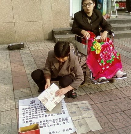 一个下午,当我下班接孩子回家时,见到路边人行道上有一位坐在轮椅上的年轻人和他的母亲,面前地上摆着一张这样的《哀告书》,旁边还有几张《绵阳日报》,上面登着他的事情。我上前询问,除了哀告书上的内容,还了解到原来报纸上登的是他出车祸后,他的未婚妻不仅没有抛弃他,还精心服侍他,与他正式结婚的感人事迹。现在,他们不仅用光了所有积蓄,还通过亲朋好友贷了30多万元的款,再也借不到钱了。但是,敬洪磊的病还需要进一步的治疗,只有出来乞讨,维持生活。在我和他母亲交谈的时候,敬洪磊脸色苍白摊在轮椅上,一直面无表情。我的内心感到非常痛心:是啊,这样年轻的生命受到这样严重的打击,可以想象他的心已经苦到无法用语言表达。当时,我也没有更多的办法帮助他们,只有拿出一点钱给他的母亲,并简单给敬洪磊讲因果报应的道理,劝他念佛。他的母亲连连道谢,敬洪磊似乎对我讲的话不反感,也没有表现出很大的兴趣。我问他可不可以看书,我给他拿书看,他表示同意。