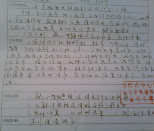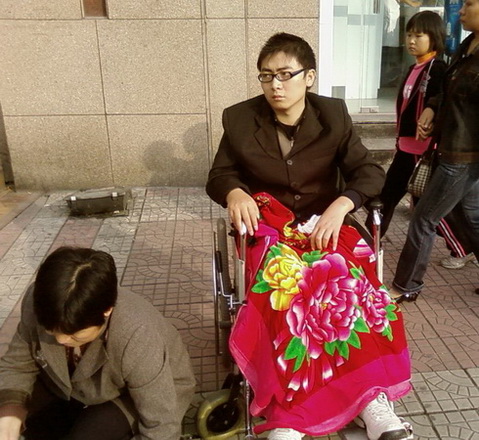 我试着给功德会镜义法师发了个短信,询问他这种情况属不属于救助对象。法师立即回信询问敬洪磊的具体情况。由于我从来没见过敬洪磊的病历,不了解他的病情,于是和他约好星期六的下午4点见面。我提前到了,一直没见到他们母子的身影。准4点,见到敬洪磊的母亲推着他过来了。原来,他们也来了一会了,但由于前几天商场的保安和城管队要驱逐他们,并且没收哀告书等资料,他们不敢在广场,只好先躲在一边,看时间到了,怕我着急,就赶紧过来了。他们带来了一些资料,那几张旧报纸用旧塑料袋小心地包装起来,这是他们心中最伤痛也最幸福的回忆。我告诉他们慈善功德会的消息,他们很高兴。征得同意后,我给他们拍了几张照片。当我提出给敬洪磊和他的母亲拍个合影时,母亲和敬洪磊的脸上都露出了久违的笑容。