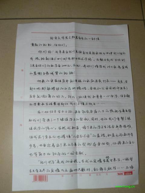 你们好!我是来自北川羌族自治县陈家坝乡四坪村6组的成浩。现就读于“四川邮电职业技术学院”。在数日前我已收到了来自你们的助学金2000元,在此,请你们接受我对大家最真诚的感谢与最诚挚的祝福!