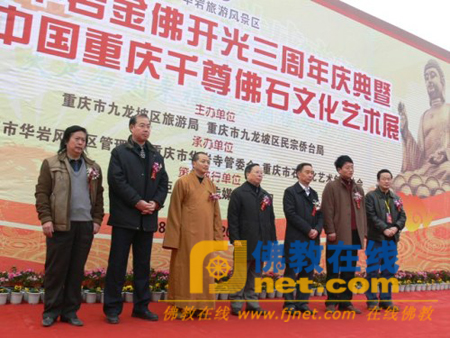 重庆市政协副主席窦瑞华,重庆市九龙坡区常委、区政府副区长秦大川,重庆市九龙坡区旅游局局长邹玉民,重庆市民宗局局长张志敏,重庆佛教协会副会长、重庆华岩寺方丈道坚法师,重庆石文化协会罗副会长,华岩佛石文化研究会会长温学礼出席了开幕式。在开幕式上,秦大川副区长发表了讲话,并由由窦瑞华副主席宣布“重庆华岩金佛开光三周年庆典暨首届中国重庆千尊佛石文化艺术展”正式开幕。