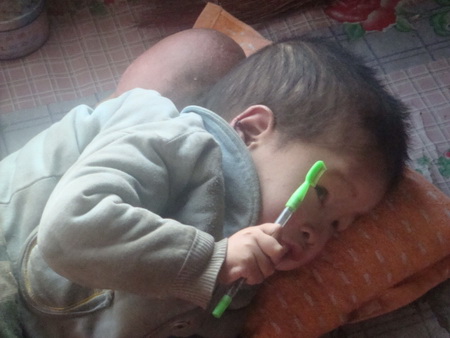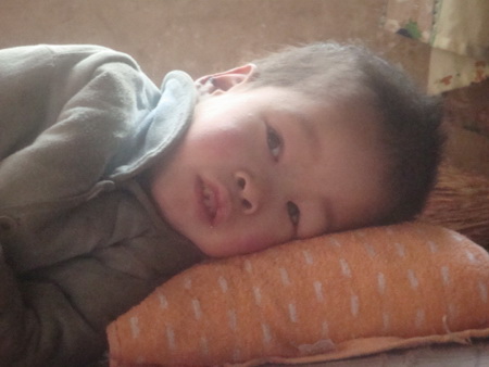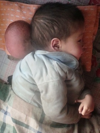 李存贵夫妻面对这个消息,如五雷轰顶,一下子傻眼了。十万元对于他们家而言简直就是天文数字,按他们家目前的收入,不吃不喝至少也要30年的才能赚到这笔钱,而这几乎是不可能的。对小战成的病,他们只能望洋兴叹,而无能为力,顺其自然的生活。今年小战成已经四岁了,模样长的越发可爱,脑后的肿物也有16cmⅹ12cmⅹ8cm大小。小战成高兴时也会叫爸爸妈妈,爷爷奶奶,哥哥常常逗他玩,他也很喜欢跟哥哥说话,有时候在哥哥,妈妈给他喂饭时,他会说“帮我后面的东西拿掉好吗?我不要这个东西!”父母每次听到这话时,内心觉得特别内疚,觉得生下来真是害了他。虽然小战成神情自如,语言清晰,问答切题,但由于双腿萎缩,脑后肿物增大,心脏功能弱,只能保持一种佝偻的姿势,长期卧床,生活完全由家人照顾。
