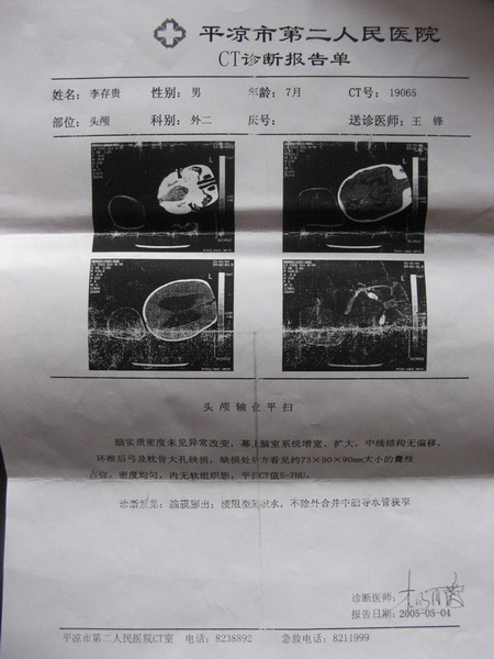 2005年5月份,小战成不知不觉中已经快周岁了,皮肤白白嫩嫩,眼睛清澈明亮,让人好生怜爱。可遗憾的是这么个漂亮的小男孩脑后的肿块不仅没有消失,反而越长越大。父亲李存贵抱着小孩时看着这个不明原因的肿物,不觉有些担心。5月4日,与妻子童西叶两人带着儿子到了平凉市第二人民医院作检查,希望医生们能给他一个答案,小孩脑后的肿物究竟是什么?那天,经过焦急的排队等待后,终于拿到了CT诊断报告单,诊断意见是脑膜膨出,梗阻型脑积水,不除外合并中脑导水管狭窄。医生说这种病最好的治疗方法是手术治疗,而且在平凉市目前还没有开展这种手术的条件,到陕西西安市是可以做这种手术的,但手术费用至少要十万元。