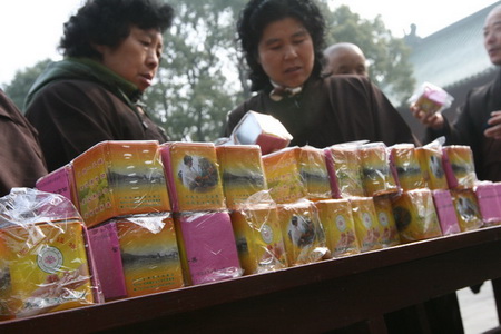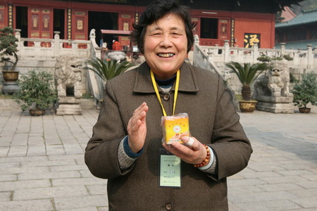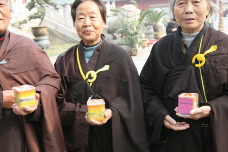 12月18日,是东林寺冬季佛七圆满结束的日子,正午时分,寺内阳光灿烂,腊梅盛开,经过21天的精进佛七修行,参加佛七的四众弟子满面红光,精神饱满。中午过堂以后,根据四众弟子的要求,东林慈善功德会在寺院内进行了储钱罐发放活动。当储钱罐一摆出来,立刻围上一大批人,争相询问储钱罐的用途以及汇款途径,东林慈善的各位志愿者热心的作了一一解释,告诉大家储钱罐是每天储存一个善念,每天储存一个爱心,是培植大家福德资粮的工具。拥有一个储钱罐,就拥有了一份善心;拥有一个储钱罐,就拥有了一份福德。志愿者对每一个询问者反复介绍的同时,储钱罐也被一个个领走。有的老居士说:“我有三个孙子,给我三个好不好?让我的孙子都能够培养爱心。”有的师父说:“我拿一些回我们寺院,去让居士发心好不好?”还有的居士说:“我给我们那里的同修捎回一些可以吗?”还有一些游人,听说了我们善款的用途以后,也加入了领取储钱罐的队伍,现场气氛一片热闹,短短一个小时的时间,我们带去的700个储钱罐也陆续被大家领走。在我们的发放活动将要结束之前,还有很多居士向我们预定爱心储钱罐。