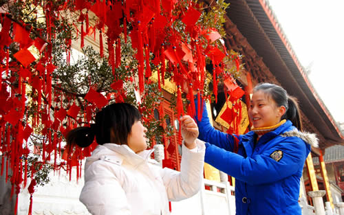 佛教胜地栖霞寺游人悬挂吉祥物祝福新年
