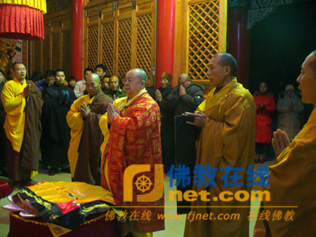 2008年12月23日,河南省云台山万善寺在大雄宝殿举行传法法会,万善寺方丈海空法师主法,开示学法前的注意事项。200多名信众参加了法会。