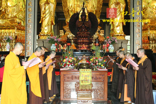 圆满法师在大雄宝殿内教众唱念