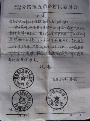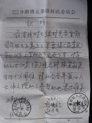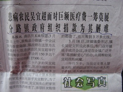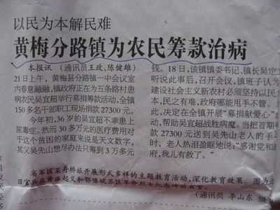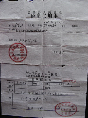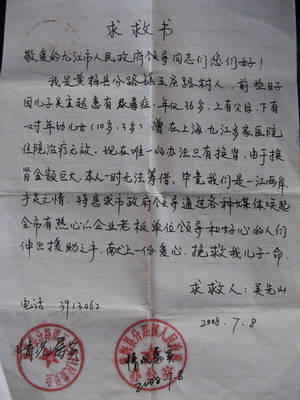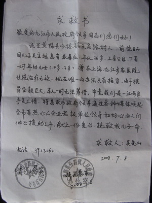 老人说干就干,当儿子在上海治疗了一个多月,花光了家里的近四万块钱时,他已经跑遍了黄梅的各大媒体,已经开始向政府,向一切有可能伸手援助的个人和单位求助。上海巨额的治疗费用不得不令儿子从上海中山医院转入九江市中医院治疗。当儿子出院回到黄梅转到九江市中医院后,吴先山的求助也取得了成效。