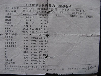 去年12月2日,一件不幸的事情突然降临到这个家庭,吴先山闻及此事,当即老泪纵横,连说“不可能,不可能,这不可能啊!”原来,在上海打工的媳妇打电话回来说儿子吴宜超得了难治之症:尿毒症!必须在医院住院透析治疗,如果配型成功的话,最好换肾,但费用至少要30万元!媳妇带着哭腔的电话令一家人情绪沮丧,家里老老少少哭的哭,叹气的叹气,在刚接到这个消息的那段时间里,整个家就像天塌下来了一样,好像一切都完了,没有希望了。
