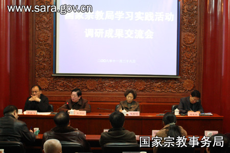 2008年11月28日上午,国家宗教事务局召开学习实践活动调研成果交流会。中央深入学习实践科学发展观活动第九指导检查组副组长陈希明,成员骆杰,国宗局党组成员、副局长王作安、齐晓飞、蒋坚永出席会议,局机关、直属事业单位全体党员,在京全国性宗教团体党支部、各离退休干部党支部书记参加了会议。