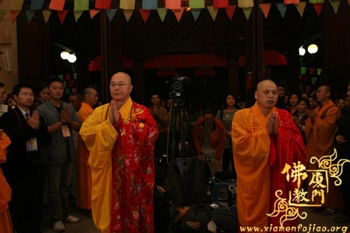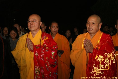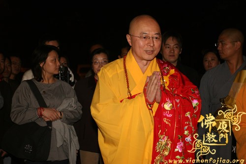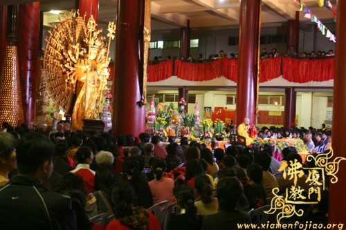 当晚6时30分,微风徐徐,灯火点缀着宽阔的庙宇,巍巍宝塔承担着人们的寄托,千手千眼大慈大悲观世音菩萨护佑着广大众生。海涛法师脸上带着喜悦与定恒法师及迎接的大众徐徐步入大悲殿,四众弟子唱赞欢迎法师的到来。定恒法师代表大众感激海涛法师在百忙中抽时间来厦门弘法,并赞叹海涛法师一行的弘法功德。随后请海涛法师为广大信众开示心灵的启迪。并于讲法结束后进行慈悲施食、供灯仪式。
