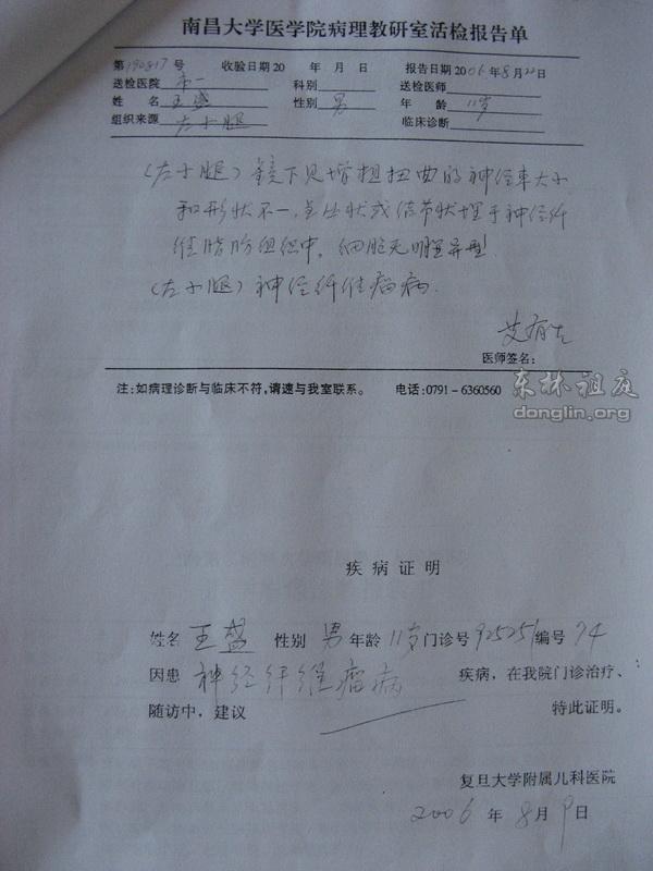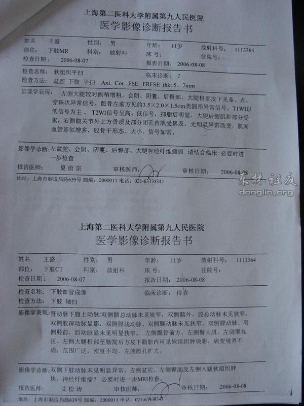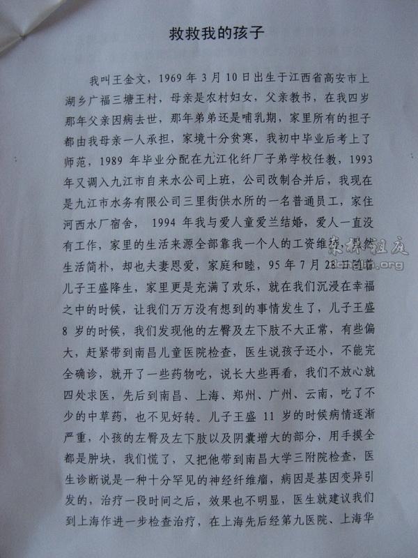 小孩叫王盛,今年13岁,在九江市六中读初二。据他的父亲王金文说在王盛8岁那年,突然发现他长有“肉疙瘩”,更让人不可思议的是“肉疙瘩”布满了左盆腔、会阴、阴囊、后臀部、大腿,摸上去软软的,像一串串的葡萄,粗略估算有数百个。医生说,在身体某些部位长一两个大纤维瘤的见的很少,可像这样永存在全身数百个纤维瘤的就非常罕见了,发病率在2500万—3000万分之一。王盛的母亲童女士说到儿子的病情,哽咽了:“儿子生下来时,只看见他后臀部有块黑斑,以为是胎记。8岁以后,他总说腿痛,身上的斑也越长越大,这才引起了我的重视,我带他到南昌、上海等大医院检查,医生诊断为多发性神经纤维瘤。”在王盛11岁时,他腿部和脚底处长的纤维瘤已做了两次切除手术,医生说他阴囊处的纤维瘤要等他长大点再做手术。
