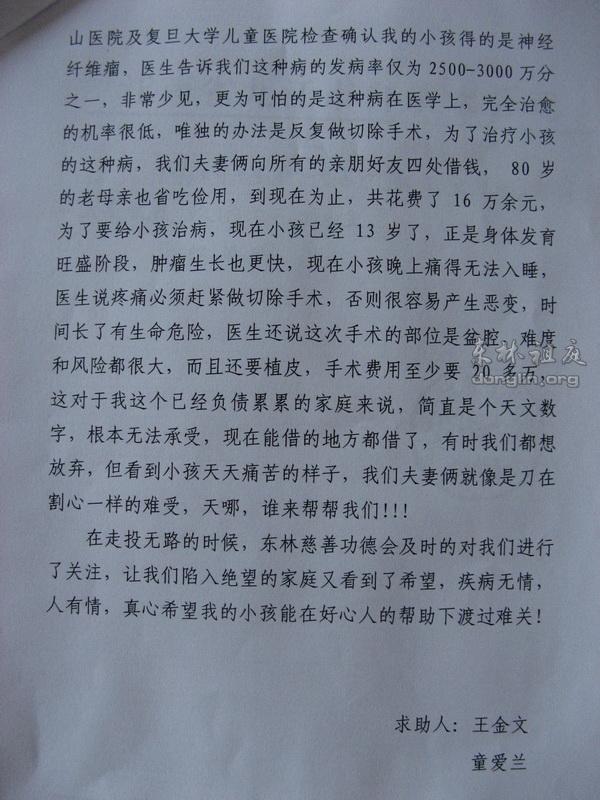 东林慈善功德会接到他们的求助资助后,派出工作人员去他们家作了调查,情况属实。13岁的王盛现在正是身体发育的旺盛阶段,肿瘤生长的也很快,现在小孩晚上痛的无法入睡,必须尽快做切除手术,否则很容易产生恶变,时间长了有生命危险。王盛现在非常需要得到社会的关爱,希望王盛在好心人的帮助下能顺利渡过难关!南无阿弥陀佛!