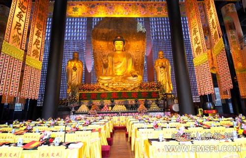 上午9时,开光法会在庄严雄伟的大雄宝殿举行,法会恭请中国佛教协会副会长兼秘书长学诚大和尚,中国佛教协会咨议委员会副主席、重庆市佛教协会会长惟贤长老,中国佛教协会副会长、上海市佛教协会会长觉醒大和尚,中国佛教协会副会长、云南省佛教协会副会长祜巴龙庄勐长老,澳门佛教联合会理事长健钊长老,印度尼西亚大乘僧伽协会秘书长学良大和尚,九华山佛教协会会长慧深大和尚,中国佛教协会副会长、四川省佛教协会会长、峨眉山佛教协会会长永寿大和尚等48位大德高僧主法,法会隆重庄严,如法如律。特别当整个开光仪式临近结束时,主法法师们举起点睛之笔,齐呼“开”,刹那间,殿堂内光明大放,佛像流光溢彩、金碧辉煌,此情此景令殿堂内观礼嘉宾一片惊叹,得未曾有。