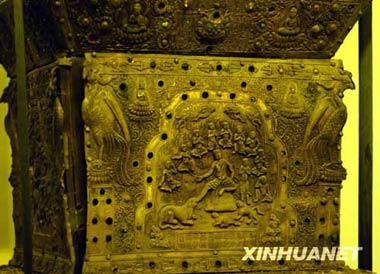 蒋老告诉记者,七宝鎏金塔是分开组装的,由塔刹、三花蕉叶、塔身和塔座组成。他从塔身部位的侧面一个破损的缝隙中,可以看见宝塔的木制结构。目前,从X光探视图分析,其中盛放着银椁,银椁内还放着一个金棺,金棺内可能有一个琉璃盒,里面应该供奉着石碑上记载的:“圣感舍利十颗”、“佛顶真骨(释迦牟尼)”、“诸圣舍利”。那么这批圣物究竟是从何而来的呢?