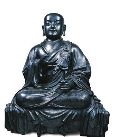宋元青铜地藏王菩萨像。高81厘米,形体、比例、相貌与真人惟妙惟肖,血脉、筋骨也清晰可见。创作中,工匠们摒弃了宗教作品一贯唯我独尊的冷漠,菩萨现罗汉像,面相方圆,为成年男子相貌,眉间现微微凸起白毫,直鼻高挺,双唇含笑,给人一种超越凡人的亲切感。