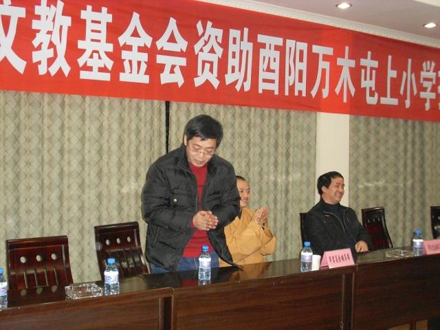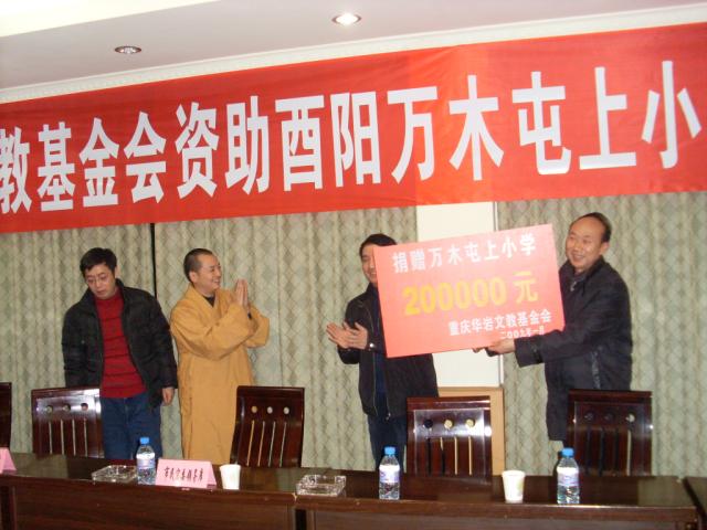 重庆市民族宗教事务委员会一直以来关心支持华岩文教基金会的工作,本次资助酉阳万木屯上小学便是经市民宗委联系的助学教育计划。重庆华岩文教基金会将尽自身的努力回馈社会,继续开展扶贫、助学的工作,晚7时捐赠仪式圆满结束。