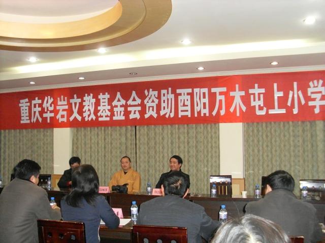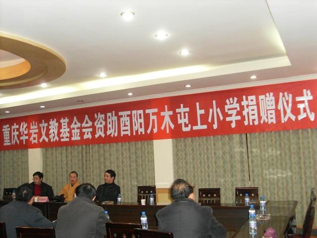 (中国佛网讯)2009年1月22日晚6时,重庆市华岩文教基金会资助酉阳万木屯上小学捐赠仪式在酉阳县政府举行。重庆华岩文教基金会理事长道坚法师、重庆市民宗委吴实再副主任、重庆市民族宗教事务委员会宗教一处喻柏炎处长、中共酉阳土家族苗族自治县委书记陈勇、副书记、县人民政府县长李方宇、中共酉阳自治县委常委、县人民政府常务副县长刘毅、中共酉阳自治县委常委、县直属机关工委书记郭文荫、酉阳自治县人民政府副县长陈颖等政府相关人员参加捐赠仪式。