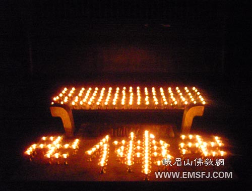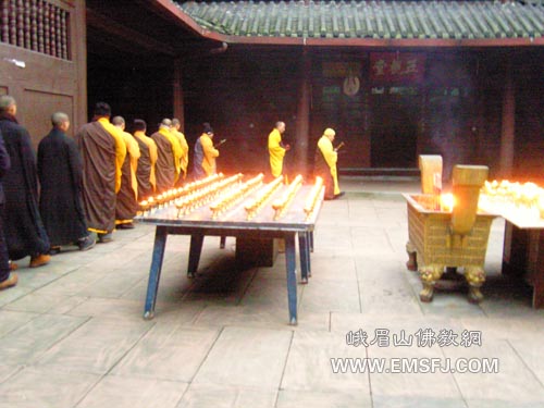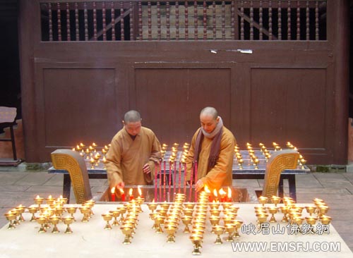 2009年1月25日,大年三十,峨眉山洪椿坪合寺僧众除了举行普供、礼忏、普佛等法会外,还于大雄宝殿前和观音殿两处燃点香灯数百盏,以特有的方式喜迎新春佳节,虔诚祈愿世界和平,人民幸福安康!