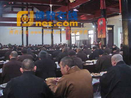 诚信法师在回顾总结发言中指出,2008年天童禅寺在基建维修、弘法利生等方面都作出了斐然的成绩,尤其在慈善、法务活动上,天童禅寺在社会各界产生了极大的影响,受到海内外人士的高度评价,这是全体大众的荣耀,也是大家辛勤劳动的结果。过去的一年,天童禅寺虽然取得了许多斐然成绩,但是仍然还有很多不足之处,有待于大家共同努力。寺院的兴盛,一是职事之间要多沟通、多协调、多尊重,共同提高自身素质;二是清众必须提高僧人意识、法律意识、道德意识,杜绝不良习气的蔓延;三是客堂一定要严格把好进单人员的考核工作,以维护全寺僧人的整体形象;四是要加强道风建设,牢牢树立因果观念,慈悲观念,大局观念,小事不计较,大事讲原则,树立正气,加强团结。全体僧众、居士、职工要密切配合,相互支持,共同将寺院管理得更好。在不断加强自身德行建设的同时,逐渐消除不同地方、不同习性带来的隔阂与误会,更加促进寺院大家庭的和谐与团结。希望在新的一年里,为纪念天童禅寺落实宗教政策改革开放30周年,全体僧众要同心同德,再接再励,攻克难关,解决问题,扎实工作,把天童寺管理得更好,让社会更加和谐,让佛教更加兴盛。