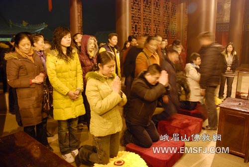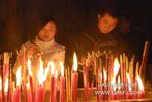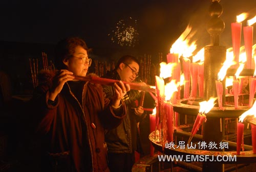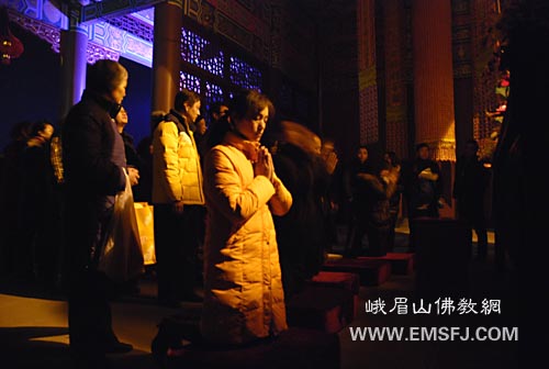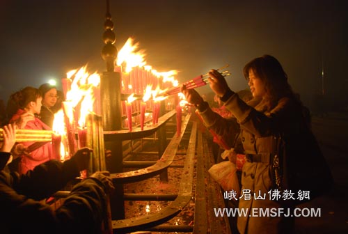 2009年1月25日晚,峨眉山大佛禅院迎来开放后的第一个除夕之夜。当夜幕降临,华灯初上时,吃过年夜饭的峨眉市民便邀朋结友,成群结队,从四面八方纷纷涌向大佛禅院进香祈福,虔诚祈请佛菩萨加被,祈求来年平安吉祥,万事如意。