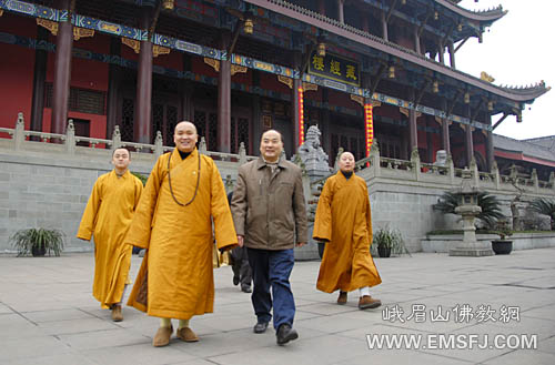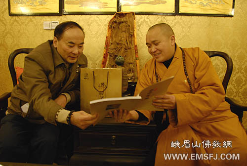 1月28日下午,四川省副省长杨志文来到峨眉山大佛禅院参观视察,受到峨眉山佛教协会会长永寿法师、大佛禅院监院常性法师等的热情接待。在东花园接待室,杨志文副省长与永寿会长进行了亲切的交谈。为让杨副省长更全面地了解大佛禅院,永寿会长特向杨副省长赠送了由峨眉山佛教协会主编的《大佛禅院》画册,并陪同参观。