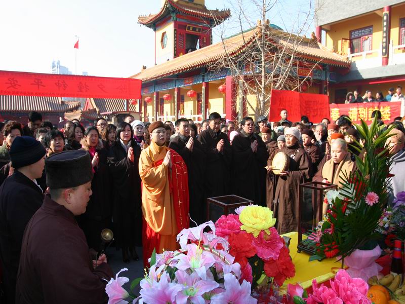 2009年1月25日晚11时40分,天津荐福观音寺隆重举行除夕撞钟吉祥大法会.住持妙贤法师拈香并亲自撞响新年钟声,随后,寺院常住法师\大护法及市民依次撞响除夕钟声.坐落于天津发祥地的古刹钟声回响在津门夜空,祈福国泰民安\风调雨顺!