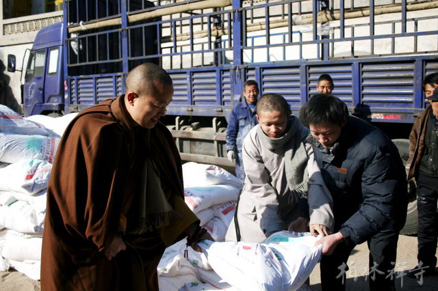 元月14日,柏林禅寺组织了一次“寒冬送粮行动”,将200吨面粉分别送到平山、赞皇、灵寿三个国家级贫困县的2000户贫困山民手中。