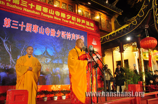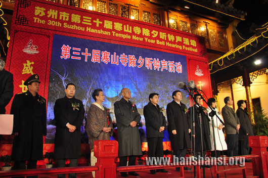 2008年12月31日晚,苏州市寒山寺第三十届除夕听钟声活动今天在寒山寺寒拾殿广场圆满举行。苏州市委书记王荣、市长阎立、统战部长周向群女士及苏州市各部委领导、寒山寺除夕听钟活动发起人日本藤尾昭先生夫妇、苏州市民、海内外信众游客数千人一起参加了第三十届听钟声活动。