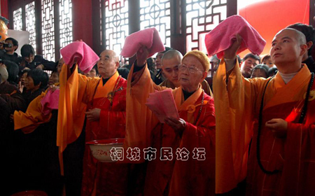 在庆典仪式上,妙安法师、慧庆法师、宽容法师分别代表省佛协、九华山佛协、安庆市佛协致贺辞。