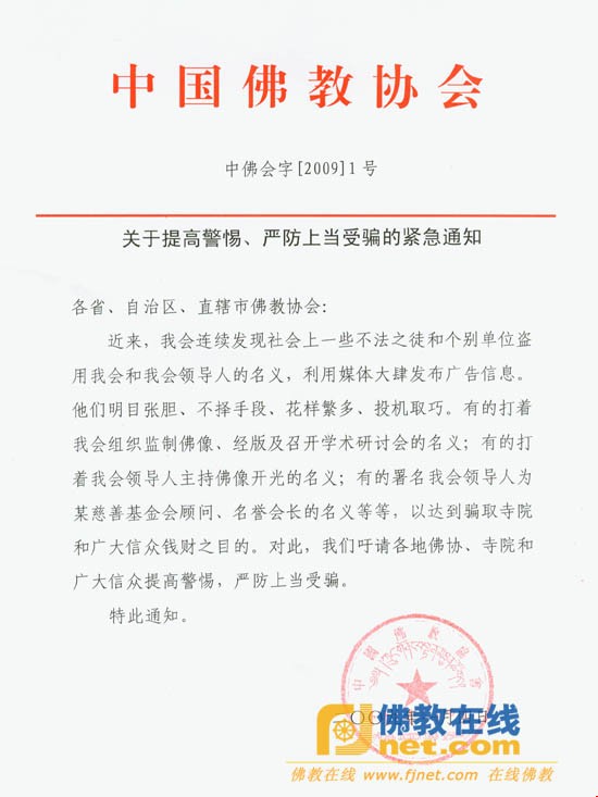 近来,我会连续发现社会上一些不法之徒和个别单位盗用我会和我会领导人的名义,利用媒体大肆发布广告信息。他们明目张胆、不择手段、花样繁多、投机取巧。有的打着我会组织监制佛像、经版及召开学术研讨会的名义:有的打着我会领导人主持佛像开光的名义;有的署名我会领导人为某慈善基金会顾问、名誉会长的名义等等,以达到骗取寺院和广大信众钱财之目的。对此,我们吁请各地佛协、寺院和广大信众提高警惕,严防上当受骗。