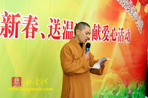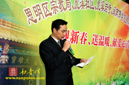新年伊始,万象更新。2009年1月1日上午10时,厦门虎溪岩寺内暖意如春,在厦门市宗教局、区宗教局、市佛教协会以及虎溪社区等有关部门的关心指导下,在虎溪岩寺方丈圣辉大和尚的领导下,虎溪岩寺全体僧众和护法善信秉承佛陀的“大慈,与一切众生乐;大悲,拔一切众生苦”的慈悲济世本怀,共同努力,积极奉献爱心,联合了思明区宗教局、虎溪社区、闽南佛学院男众部众缘爱心小组隆重举行“迎新春、送温暖、献爱心”的慈善捐赠活动。捐赠仪式由虎溪岩寺书记传航法师主持。