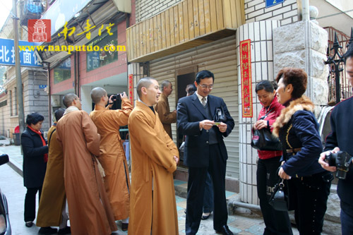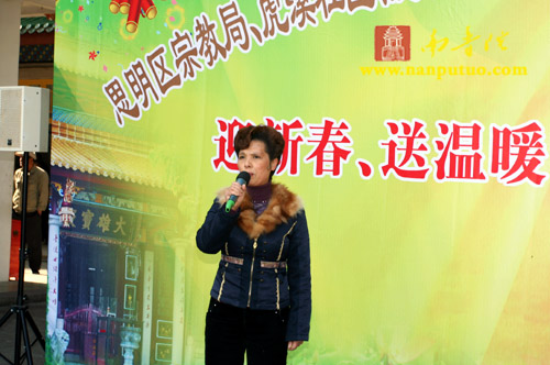 参加活动的嘉宾有:市民宗局蔡永华副局长,开元街道人大工作室王主任及各街道诸位领导,思明区宗教局黄诚局长,虎溪社区谢小茹书记和陈棉花主任,闽南佛学院男众部众缘爱心小组的成员以及虎溪岩寺常住诸位法师、护法善信等。闽院男众部众缘爱心小组副组长大圆法师、虎溪岩寺副寺向协法师、谢小茹书记、王主任、黄诚局长、蔡永华副局长在捐赠仪式上先后发表讲话,对这扶贫济困、关注弱势群体的善举给予赞叹,并表示敬意和感谢。虎溪岩寺举办这样的爱心活动已有四年,每年利用元旦之际,为思明区各街道的贫困家庭送去新年慰问。今年的慈善捐赠活动共为思明区各街道的200多户贫困家庭献捐献善款10万余元,以此表达佛教徒对社会大众的感恩和祝福!为构建“和谐社会、和谐厦门”奉献佛弟子的颗颗爱心!