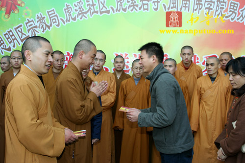 新年伊始,翔鹭齐飞。2009年1月1日,在新年的第一天,闽南佛学院男众部众缘爱心小组的成员受闽院教导长达源法师的委托,前往虎溪岩寺参加思明区宗教局、虎溪社区、虎溪岩寺和闽院男众部众缘爱心小组联合举办的“迎新春、送温暖、献爱心”慈善捐赠活动,让爱心点燃希望,真情温暖万家。